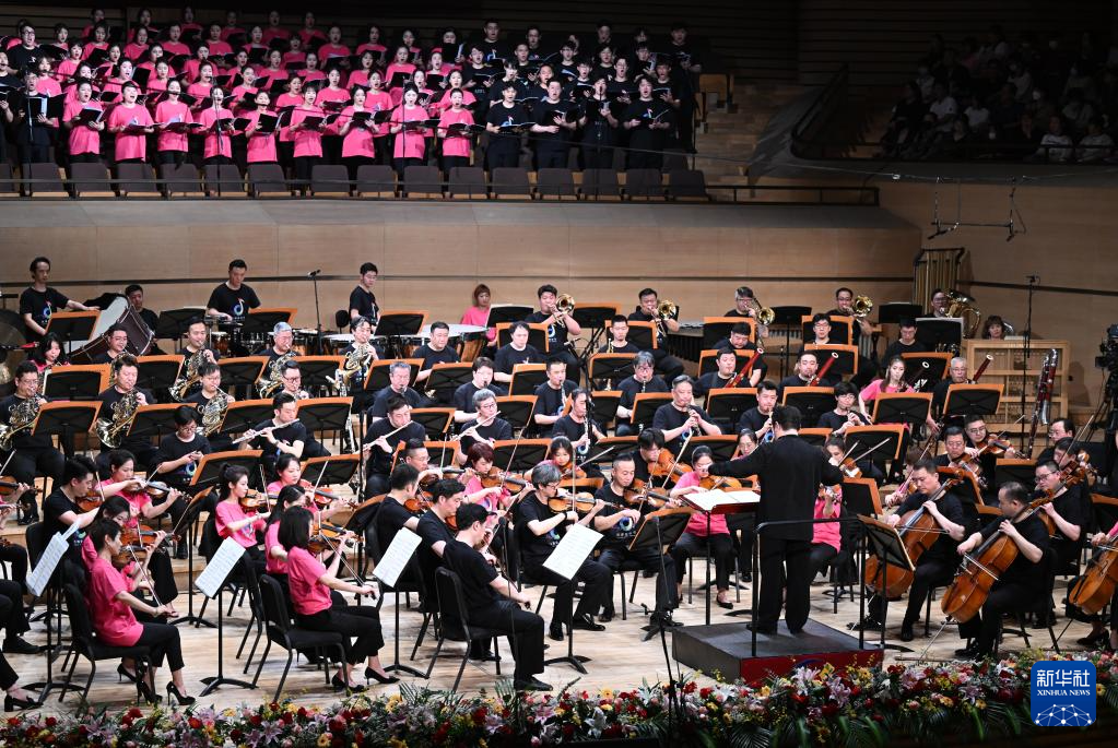 5月25日,在天津大剧院音乐厅,由天津歌舞剧院、天津交响乐团等组成的天津百人联合乐团在舞台上演奏。