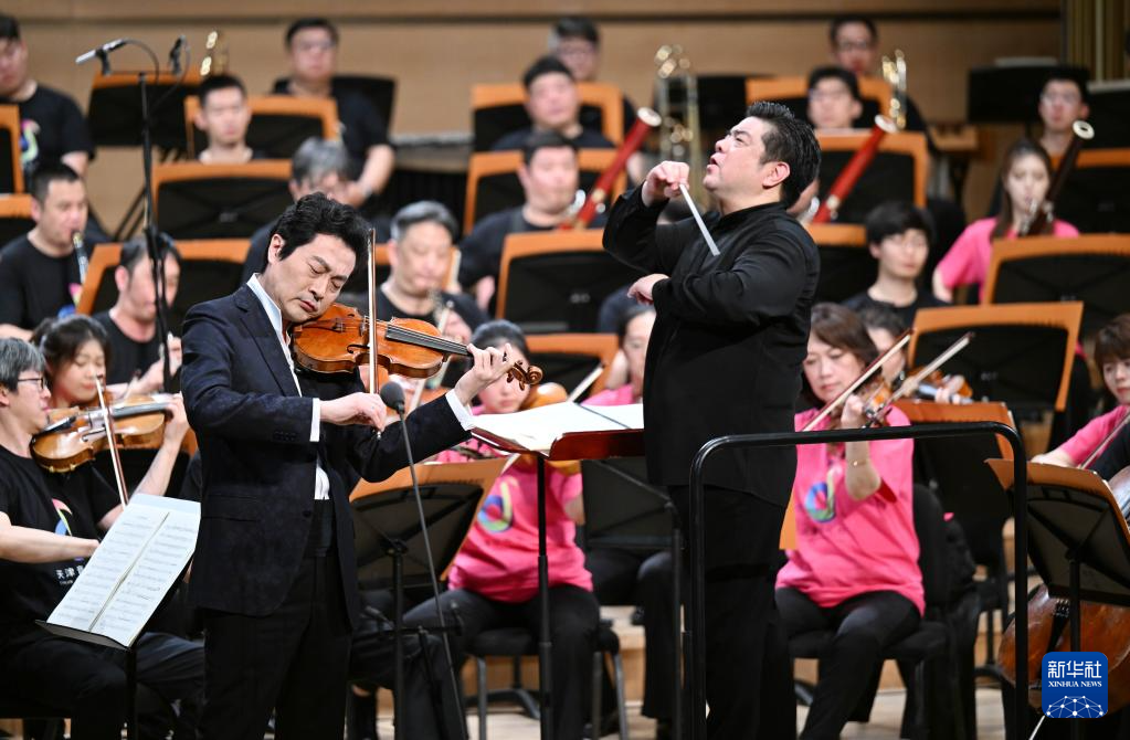 5月25日,在天津大剧院音乐厅,小提琴演奏家吕思清(左)和指挥李飚(右)在舞台上演出。