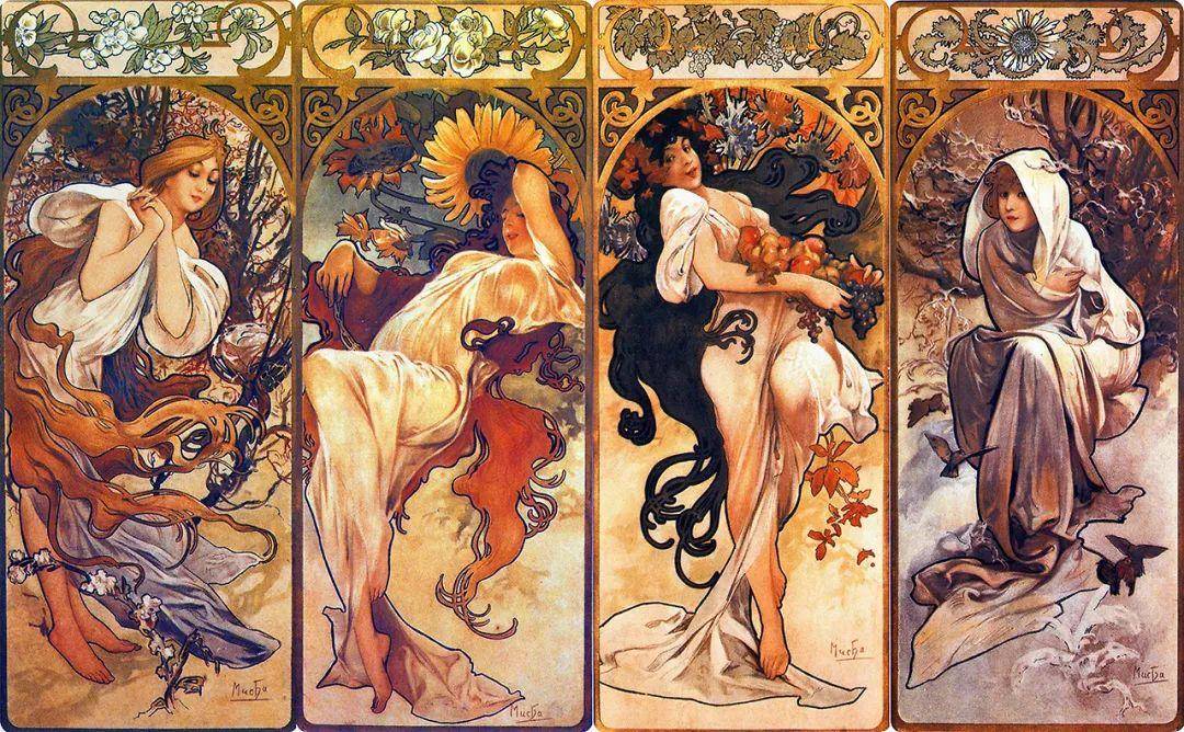 穆夏童年是摩洛维亚布鲁诺圣彼得罗马天主教堂唱诗班的成员,这所教堂有着丰富的巴洛克风格艺术品收藏。高中毕业后穆夏决心成为画家,先后在慕尼黑艺术学院、巴黎朱利安学院学习。早年穆夏曾为一些公司画演出的布景,还做过一段时间的墓碑,后来因为投资人中断了对穆夏的资助,生活窘迫的他不得不承接大量廉价的杂志插图绘制工作,在穷困潦倒中,穆夏的艺术风格也开始逐渐成型。