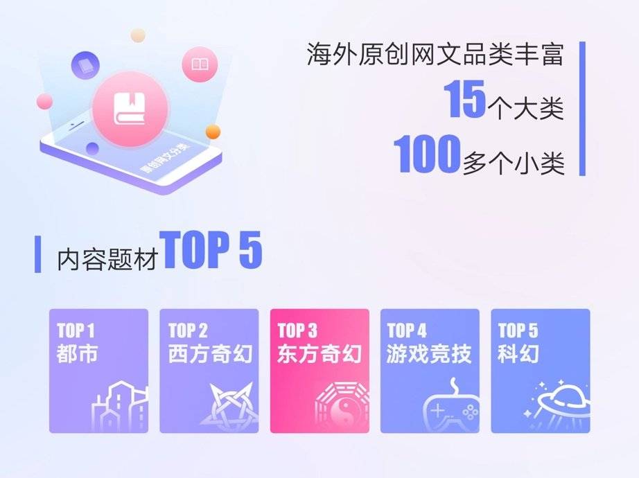 据数据显示,目前约有34万名海外网络作家,推出约50万部海外原创作品。内容涵盖15个大类、100多个小类,都市、西方奇幻、东方奇幻、游戏竞技、科幻成为前五大题材类型。其中,近95%的东方奇幻题材作品由海外作家原创,道法、武侠、熊猫、高铁等中国元素融入其中,吸引了众多读者追更。