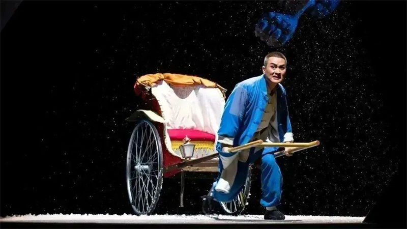 舞台上,祥子买车丢车,丢车买车,三起三落,历尽坎坷。那辆贯穿全剧的黄包车,成为全剧灵魂所在。祥子的扮演者、省京剧院优秀青年演员黄金朝说,光是拉车这一个动作,就非常讲究。“第一次出场时,祥子是非常高兴的,所以拉车的脚步很轻快。”为了模拟拉车时的动作,黄金朝参考了很多旧时影像,向老版“祥子”扮演者、该剧导演陈霖苍请教。黄金朝说,他的胳膊从低到高的升起,再由高向低落下,在虚空中模拟拉车的动作。到了故事的结尾,备受社会打压的祥子在漫天风雪中脚步沉重,那一次拉车是特别慢的,象征着小人物的悲哀。