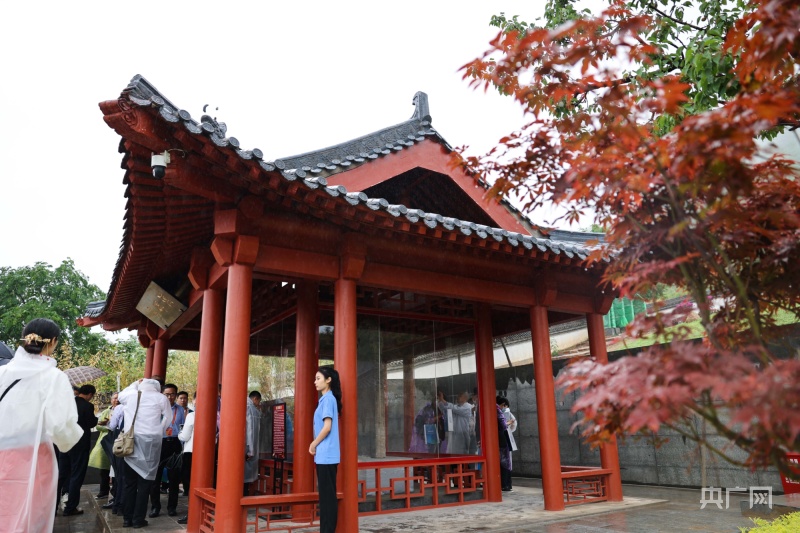 参观者在汉碑亭观赏《祀三公山碑》和《白石神君碑》(央广网记者王伟倩摄)