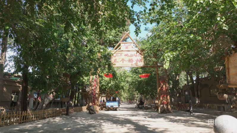 鲁克沁镇党委副书记卡特·阿不力米提介绍:“三个桥村北面就是二塘沟,在以前丰水期时,大量的水源从山里向南一泻而下,流经三个桥村,河渠将村子南北分开,村民们曾在河渠上修了三座小桥,我们村的名字也由此得来。这座村子就和它的名字一样朴实、宁静,而这些也是三个桥村最大的特色。”