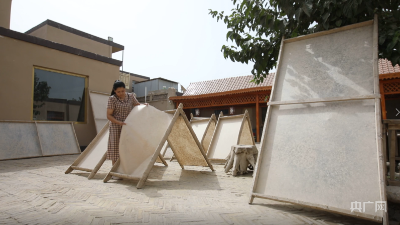 鲁克沁镇党委副书记卡特·阿不力米提介绍:“桑皮纸以桑树皮为原料,经过伐条、浸泡、锅煮、锤捣、发酵、滤水、晾晒、打磨等13道主要工艺制作而成。三个桥村虽不是桑树皮造纸的起源地,但完整保留了这项古老技艺。桑皮造纸术与蔡伦造纸工艺相似,原料都是就地取材,蔡伦造纸用的是当地盛产的竹子,三个桥村造纸用的则是房前屋后的桑树。桑皮纸虽已退出现代社会,但这项古老技艺与旅游结合后,演变为一项非物质文化遗产,供游客参与、体验。”