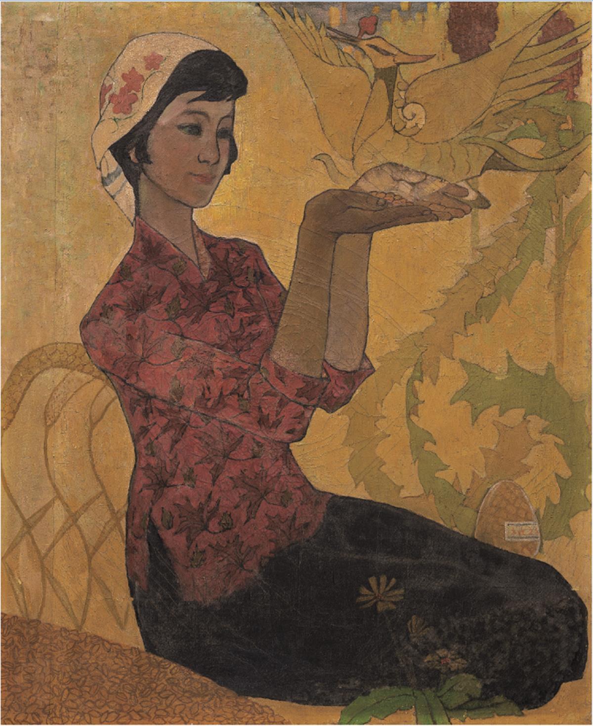 著名西方美术史专家吴甲丰早年曾在《萌芽》发表 《金色的种子——漫谈第二届“青展”中的油画》一文,极目新闻记者在文章中看到印有此文的期刊一并于湖北美术馆展出。吴老写道:那幅运用装饰手法很成功的作品,画的是一个穿紫红衣裳的农家少女,端坐在黄澄澄的庄稼地里,双手捧起一把种子像是在奉献。紧贴双手的后面,是临空飞翔的凤凰,像是屡见于古代壁画中的纹样,但又分明是一只有生命的飞鸟。根据我的理解,这里面好像有一种象征的意义:凤凰在劫火中重生了,年青一代把金色的种子献给它。“金色的种子”,颗颗粒粒都寄托着咱们的希望。