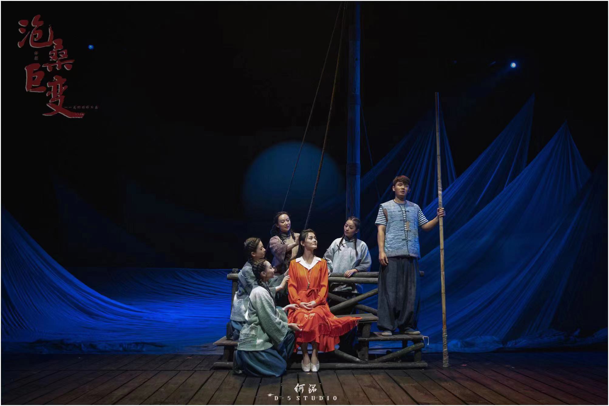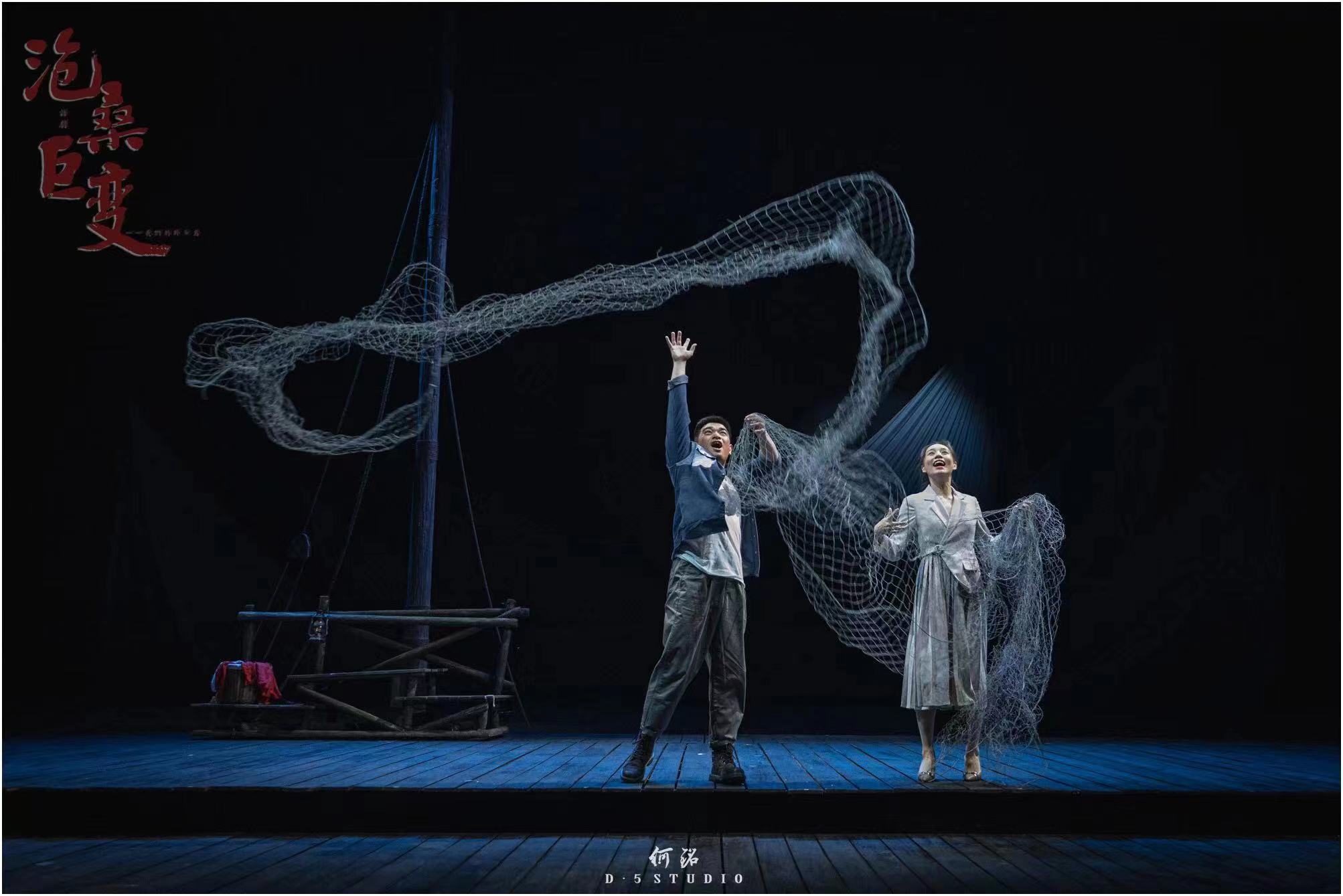 在人物塑造上,《沧桑巨变——我们的卧鱼岛》剧中,来自南通艺术剧院的青年演员们细心揣摩角色,与人物心灵相通,将时代浪潮洗涤下的卧鱼岛人一一生动地“立”在舞台上。真性情有担当的江海,美丽灵动、化身为刀鱼的白月,致力于长江保护、不惜与亲人决裂的江流……每一个角色都那么鲜活,那么令人感动,他们是长江沿线渔民的缩影,他们伴江而生,依江而兴,眷念着母亲河长江,早与长江融为一体。在舞台呈现上,该剧创造性地用似绸似纱的道具来表现江水,营造波澜起伏的水世界,并贯穿全剧。江海与白月从相识到相知到相恋的爱情,双胞胎儿子江河、江流的成长,都发生在这如梦似幻的背景前。随着剧情的推进,这幕道具时而似江水,时而如幕布,时而又如渔网,再配以长江渔歌等音乐的烘托,营造出简约灵动的气氛,传达了东方诗意色彩,使观众仿佛置身于卧鱼岛上,来到了长江口的卧鱼岛。