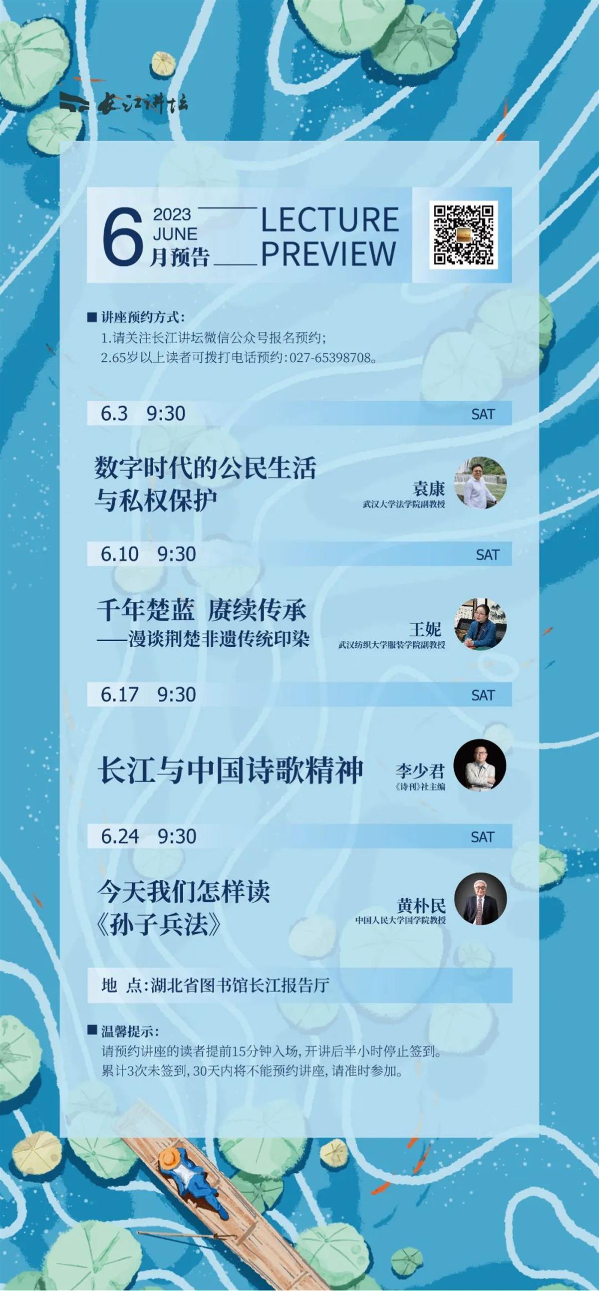 极目新闻记者获悉,6月“长江讲坛”讲座安排已出炉,私权保护、非遗印染、长江诗歌、孙子兵法,6月的“长江讲坛”将解码这四个关键词。具体安排如下——