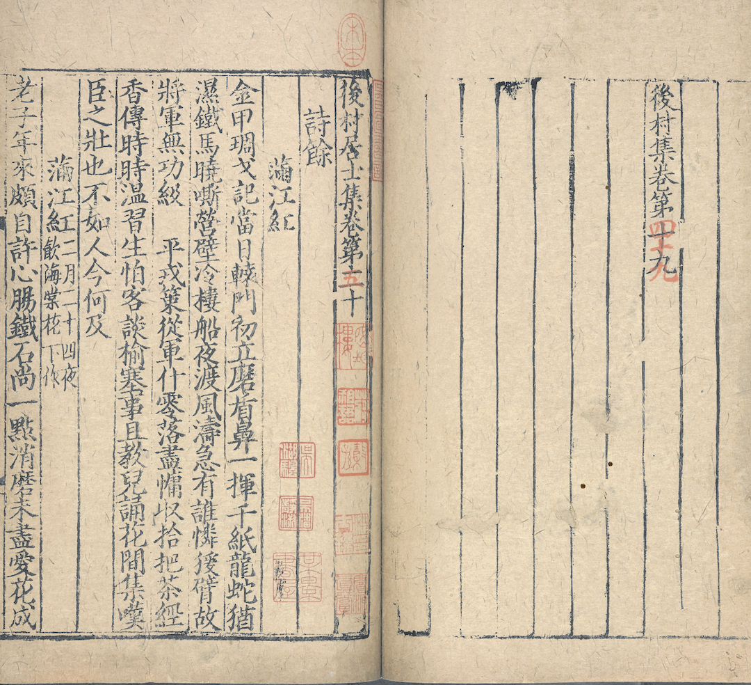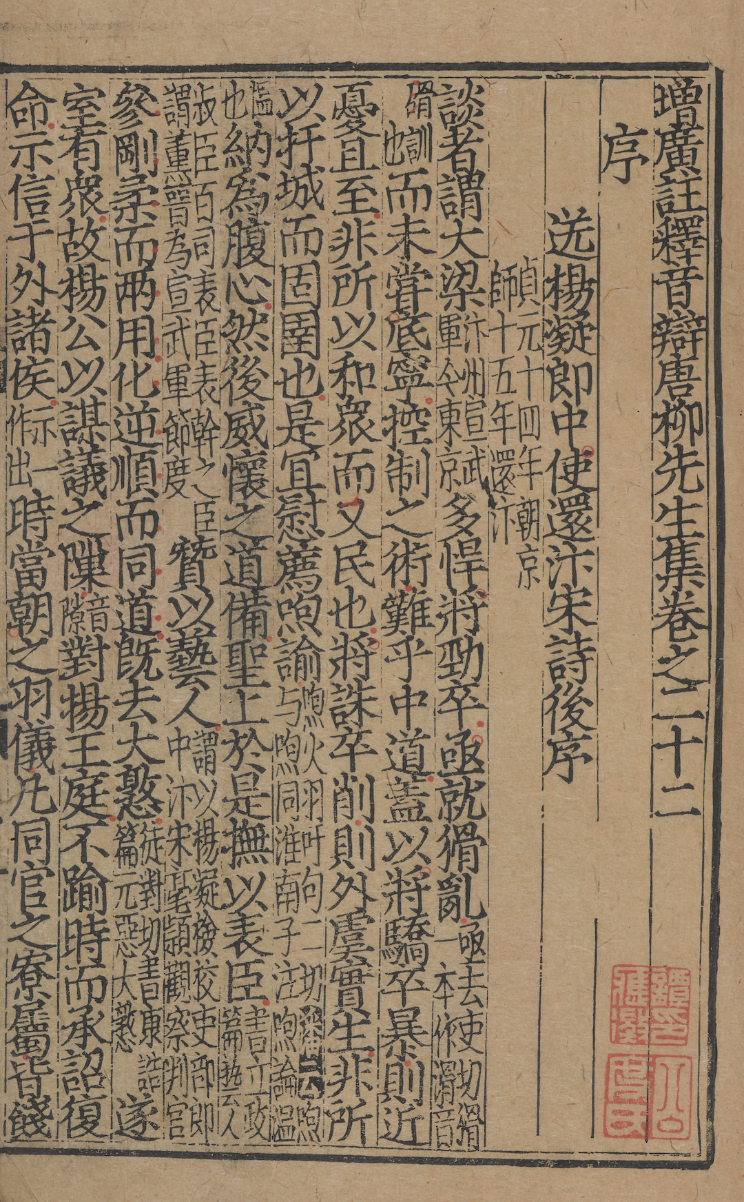 受《诗经》影响,诗歌一直是中国文学的正宗。宋初尚模仿唐代,王禹偁等模仿白居易,是为“白体”;林逋、寇准等模仿贾岛、姚合,是为“晚唐体”;杨亿、钱惟演、张咏等模仿李商隐,是为“西昆体”。此后,宋元诗人能在吸收唐诗的丰神情韵的同时,别辟蹊径,形成以理趣见长的新风格。散文方面,宋初柳开、范仲淹等人承袭晚唐五代之风。之后,散文家们秉持韩愈、柳宗元“以文载道”的创作理念,务去陈言,开创了散文创作的辉煌。在中原王朝之外,以金代文学成就最高,而金代文学又以元好问最为著名。他诗祖李、杜,词学苏、辛,文学韩、欧,法度谨严,“蔚为一代宗工”。上海博物馆藏一部元建安余氏勤有堂刻明修本《分类补注李太白诗》二十五卷(存二卷),宋杨齐贤集注,元萧士赟补注,是现存最早的李白诗歌注本。余氏勤有堂即前述《仪礼图》的刊刻者。与李白诗歌注释者稀少不同,宋人“文尊韩柳,诗尊老杜”,杜甫诗歌、韩柳文章在宋代的注释者非常多,以至于出现了“千家注杜、五百家注韩柳”的盛况。上海博物馆藏一部宋刻本《杜工部草堂诗笺》五十卷《传叙碑铭》一卷《年谱》二卷《诗话》二卷(存五卷)【图14】。虽然蔡梦弼的《笺注》全文不存,但宋祁撰《传叙碑铭》、赵子栎和鲁訔撰《年谱》和蔡梦弼辑《诗话》皆全存,为孤本,可以与国家图书馆、上海图书馆、北京大学图书馆所藏残本合璧,具有很高的学术价值。此外,成都杜甫草堂亦收藏有有此书残本。《增广注释音辩唐柳先生集》四十三卷《别集》二卷《外集》二卷《附录》一卷(存九卷)【图15】,各部分原为单行,合刻则大概是南宋建阳书坊所为。宋刻本半叶12行,行21字,“元代覆刻是本,改为半叶十三行,行二十三字。流传颇多,世人多指为宋刊,盖缘未见是本,故致误认。”上海博物馆藏本字体、版式具有明显的元代福建坊刻本风格。此外,国家图书馆和绍兴市图书馆另有元刻残本。明代覆刻元本,亦半叶13行,行23字,存世较多。