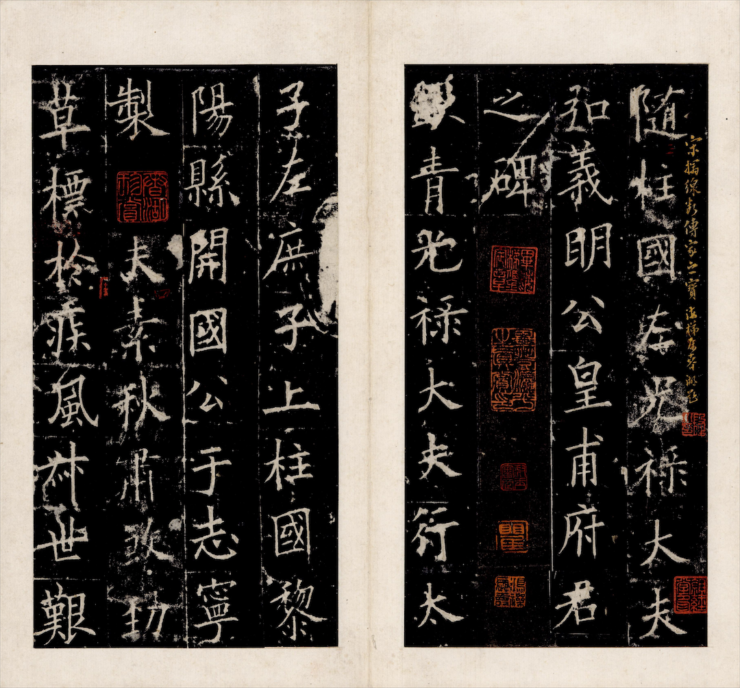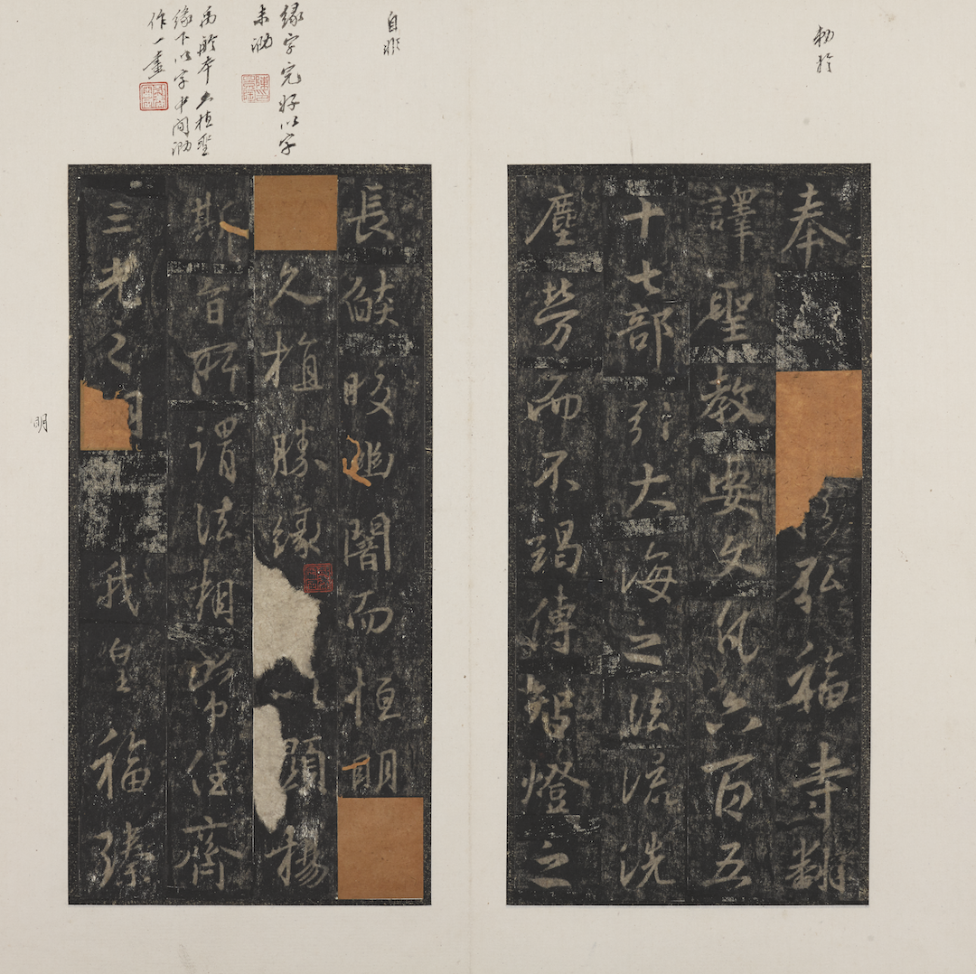 一般而言,碑石的宋拓本多为剪裱本,鲜见整拓。其内容则多为汉、唐碑,尤其是《孔子庙堂碑》《九成宫醴泉铭》《皇甫诞碑》《怀仁集王圣教序》《李思训碑》《麓山寺碑》《麻姑仙坛记》等唐代名碑。《孔子庙堂碑》,虞世南撰文并书丹,唐睿宗李旦篆额,唐贞观初年立碑,不久毁佚。武周重摹,石亦不传。上海博物馆所藏宋拓本为宋王彦超重摹“陕西本”,为清宫旧藏。《九成宫醴泉铭》,魏征撰文,欧阳询书丹,唐贞观六年(632)刻石。碑石今在陕西麟游县,破损较严重。故宫博物院藏北宋拓本是现存最早的拓本,旧藏于明驸马李祺。上海博物馆所藏三册均为南宋拓本【图24】。《皇甫诞碑》,于志宁撰文,欧阳询书丹。碑文不书刻立年月,罗振玉《读碑小笺》考证为唐贞观十七年(643)刻。碑石明代已断裂,今在西安碑林博物馆。上海博物馆藏南宋拓本一册【图25】。《怀仁集王圣教序》,唐太宗李世民撰序,唐高宗李治撰记,唐释怀仁集王羲之行书,唐咸亨三年(672)刻石。碑今在西安碑林博物馆。此碑宋拓本存世较多,上海博物馆藏六册,或北宋拓“慈”字未损本【图26】,或南宋拓未断本【图27】。《李思训碑》和《麓山寺碑》都是李邕撰文并书丹,前者上海博物馆藏宋拓本一册,后者藏二册。李邕所书《法华寺碑》的宋拓孤本,亦藏上海博物馆。颜真卿书《大字麻姑仙坛记》宋拓本,上海博物馆藏一册及一残本(存2开)。至于张旭楷书《郎官石柱记》的宋孤拓本【图28】,明王世贞旧藏,由孙伯渊捐赠上海博物馆。孙氏所捐赠者,还有前述《李思训碑》及宋拓孤本《方圆庵记》。《方圆庵记》系沈周旧藏。此外,上海博物馆还藏有姜晞书《姜遐碑》、张从申书《李玄静碑》及佚名书《碧落碑》宋拓本各一册。至于金刻金拓《蜀先主庙碑》,为唐顺之旧藏,又经刘鹗、吴湖帆收藏,亦为孤拓。而更值得注意的一部宋拓孤本,是徐勉撰文的《梁萧敷及敬太妃墓志》【图30】。南朝屡有碑禁,碑石存世者很少。此拓为潘祖荫极为珍视之物,传吴湖帆后,吴氏将其与前述《梅花喜神谱》等列为吴氏文物四宝之一。上述宋拓本的碑文往往由名家书写,于是在郡望、世系、职官、地理等史料价值之外,它们又成为学习书法的必备品。