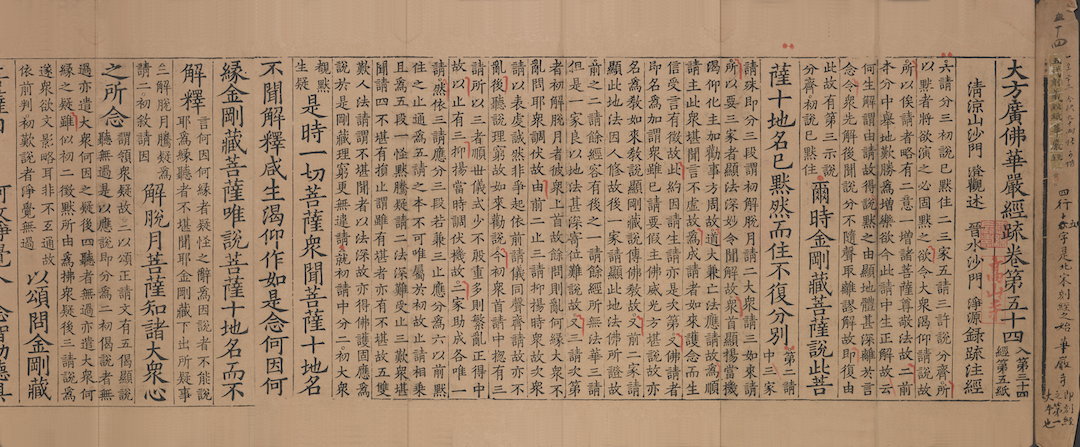 与儒家经典需要借助注疏才能通读一样,汉文佛经文义深奥难懂,在宋元佛学文人化、世俗化、平民化的发展形势下,佛经注疏的需求激增。上海博物馆藏佛经注疏宋刻残本3部,分别是:南宋绍兴十六年(1146)刻本《大方广佛华严经疏》六十卷(存一卷),唐释澄观撰;宋两浙转运司刻本《大方广佛华严经疏》一百二十卷(存二卷)【图13】,唐释澄观述,宋释净源录疏注经;南宋刻本《金刚记外别解》四卷(存一卷),南宋释观复述。它们均为叶恭绰旧藏。