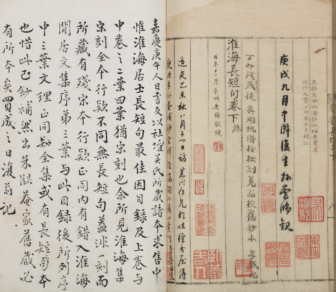 宋代文学创作活动十分兴盛。宋人创作了大量诗歌,举其著者,有欧阳修、王安石、梅尧臣、苏舜钦、苏轼、“中兴四大家”、“永嘉四灵”等以及江西诗派、江湖诗派等诗人群体。诗歌之外,词体不断发展而成熟,使得词成为宋代文学的最高成就。在欧阳修、王安石、苏轼等大文豪之外,还有张先、柳永、晏殊及其子晏几道、秦观、周邦彦、李清照、辛弃疾、姜夔、吴文英等,名家名作,或豪放,或婉约,层出不穷。散文方面,北宋时期,范仲淹、欧阳修、王安石、三苏、曾巩等名家辈出;到南宋,吕祖谦、朱熹、陆九渊、陈亮、张栻等理学家创作了大量散文。在散文创作之外,还有《三苏文粹》《宋文鉴》《文章正宗》《续文章正宗》《文章轨范》等选本编成印出。元代诗、词、文三体相对衰微,有“元诗四大家”之称的虞集、杨载、范梈、揭傒斯,其诗歌成就远不如唐宋时期。不过,元代在文学体裁上有所创新,产生了杂剧和散曲。上海博物馆藏南宋嘉定间郭森卿刻本《乖崖先生文集》十二卷《附录》一卷【图16】、宋绍兴二十二年(1152)抚州州学刻本《谢幼槃文集》十卷【图17】,镌刻精良,原来都是潘祖荫滂喜斋的插架之物,都经《滂喜斋藏书记》著录。存世宋刻本绝大多数为残本,而这两个孤本均为全本,为宋本上驷,具有十分重要的文献价值。《谢幼槃文集》曾流落异邦,由杨守敬购回,可谓中日汉籍交流史上的一段佳话。元天历元年(1328)范氏褒贤世家家塾岁寒堂刻本《范文正公集》二十卷《别集》四卷《遗文》一卷【图18】,也是潘氏滂喜斋旧藏,经《滂喜斋读书记》著录。从此本中所附签条可知,它曾于1937年在苏州图书馆举办的“吴中文献展览会”展出过。范氏岁寒堂是元代苏州私家刻书的代表,所刻范仲淹集传本较多。而此本值得重视是因为它的版本特征。张元济为潘宗周作《宝礼堂宋本书录》,著录了此书,是张氏以此书为宋本,版式为“版心白口,单鱼尾”,而“其版心细黑口、双鱼尾,上兼记字数者,为元版补配之叶”。张氏判断版本的理由是“宋刻书体方整,覆本则转而圆润,此中界限,判若鸿沟”。陈先行先生对此书有过细致的研究,认为其版本应当著录为:“宋乾道三年(1167)鄱阳郡斋刻淳熙十三年(1186)修补增刻嘉定五年(1212)重修元天历元年(1328)范氏岁寒堂修补印本。”他们揭示了此书版片中存有宋版,确为事实。不过,考虑到范仲淹全集内容的复杂性、此版底本南宋鄱阳郡斋本印本不存而无从对照,以及现存多部《范文正公集》二十卷与《别集》四卷、《遗文》一卷合编的传本,其书叶均相同,我们尚不能排除此书雕版鸠工于宋而蕆事于元的可能性,所以沿用旧著录是一个比较稳妥的办法。还需特别指出,此书《遗文》一卷,其作者应为范纯仁、范纯礼、范纯粹,各目录书均失录范纯礼,应予改正。元后至元三年(1337)范氏岁寒堂刻本《文正公尺牍》三卷可与前书合为一编,但上海博物馆所藏之本并非潘氏旧藏,天头、地脚均经裁切,故另算一书,予以单独编号。同为潘氏滂喜斋旧藏、经《滂喜斋读书记》著录的还有南宋乾道刻本《淮海居士长短句》三卷【图19】。书中有黄丕烈两跋,说此本“目录及上卷与中卷之二叶、四叶犹宋刻也”,“前目录后有《淮海闲居文集序》四叶,尤为可宝”。其余书叶则是明末清初藏书家朱之赤的抄补。此本后归吴湖帆收藏。同为吴湖帆收藏的还有宋刻本《后村居士集》五十卷《目录》二卷(存二卷)【图20】。此本曾由黄丕烈、汪士钟等名家收藏,又有吴湖帆配画,为之增色不少。旧藏于徐乃昌的元刻本《叠山先生批点文章轨范》七卷(存五卷),是此书的最早刻本,传本稀少,海内另有国家图书馆、中国社会科学院文学研究所各藏一部。至于宋刻本《庐陵欧阳先生文集》六十四卷(存二卷)、南宋绍兴龙舒郡斋刻公文纸印本《王文公文集》一百卷《目录》二卷(存七十二卷目录二卷)【图21】,则为海内孤本,皆具有重要的版本文献价值。《王文公文集》版心有无鱼尾、单鱼尾、双鱼尾三种形式,应当不是一时所刻。今后修订刻工类工具书时,应注意其间差别,予以细化。其书纸背公文、信札很值得重视,上海博物馆于1990年将其影印出版,名为《宋人佚简》。陈先行先生认为“纸背之信札很可能是抄录的副本而非真迹”。