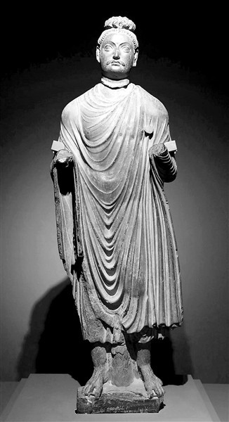 展厅伫立一尊重要的白沙瓦博物馆藏佛立像,如真人大小,鼻梁高挺面似欧罗巴人,一腿微曲重心凸显,具有典型古希腊、罗马雕塑特征。袈裟下仍见躯体之美,这样的表现手法或间接关联着中国美术中的“曹衣出水”。这件典型犍陀罗风格造像作于公元1-2世纪佛教飞升的早期。