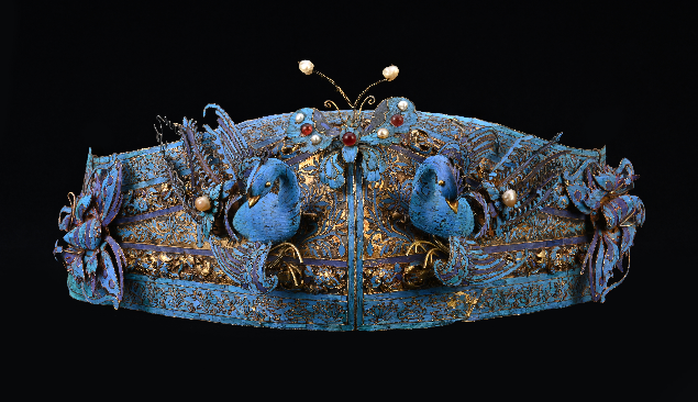 彼时女性常被文献记载排除在外,除非她们因丈夫或儿子的名气而“附属”出名。然而,留存的物件尚可帮助我们重新想象这些女性和她们生活的世界。展览展出的绘画、版画、服装、家具等是她们生活的证明。其中一款头饰采用了晚清流行的点翠工艺,其上装饰着珍珠、宝石和翠鸟羽毛。