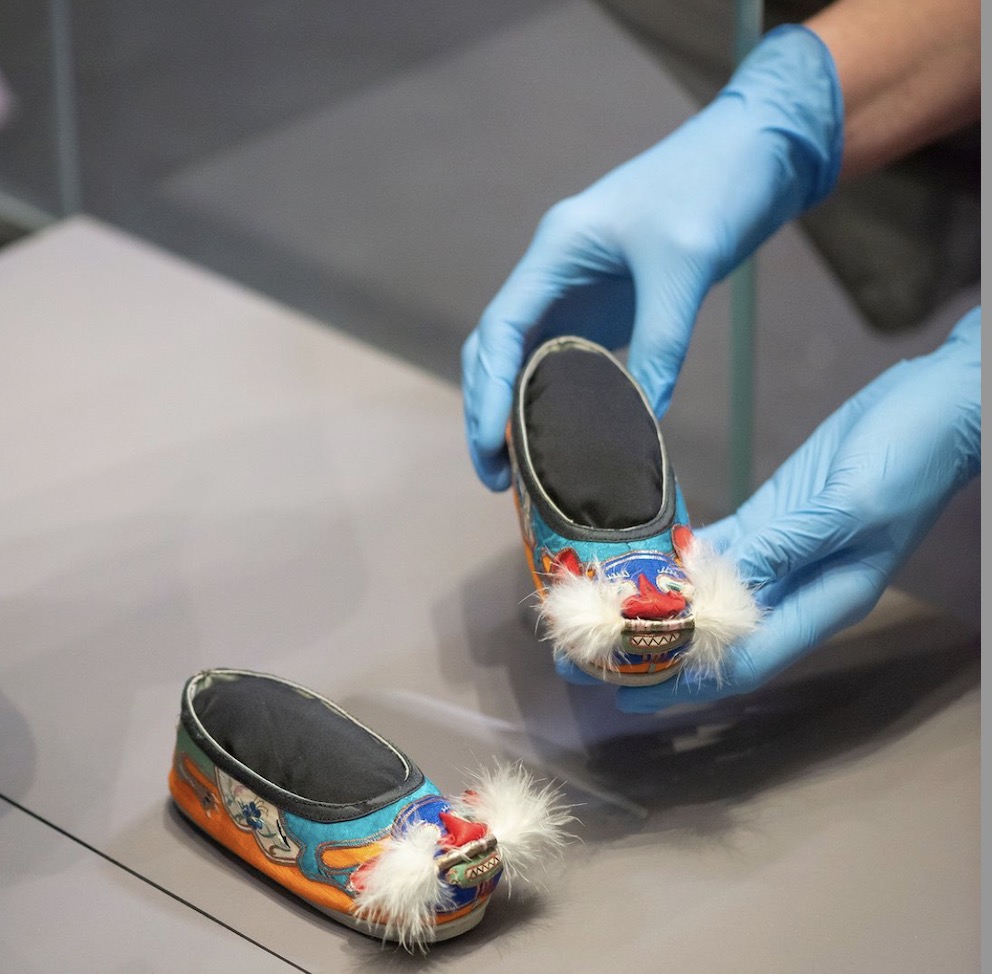 大英博物馆重现了19世纪中国宫廷的封闭世界,从始皇帝到末代皇帝,似乎没有多大改变。进入王朝核心圈、成为近臣,除了获得权力外,也处于一种仪式性的氛围中。服装本身就是仪式的一部分,现在看来是令人难以置信的艺术品:以金银细丝刺绣的蝴蝶、盘龙精心装饰的长袍和礼服。展览中多件旗袍属于慈禧,她从1861年到1908年是清王朝的实际统治者,她每天会依据不同的场合更换多套华丽的服装;与其共同陈列的是宫廷戏剧表演的服装和配饰。戏剧与现实难以区分,或许在这个岌岌可危的权力中心,日常生活也如此正式。