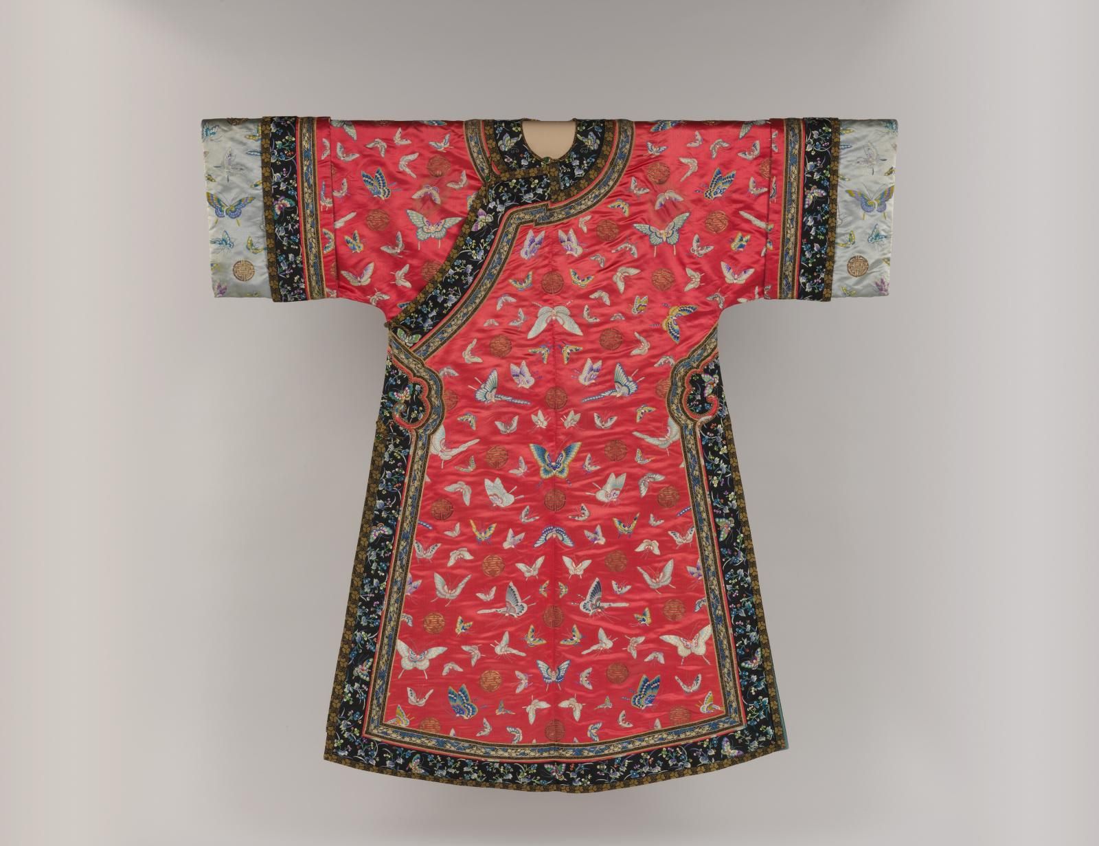 1796年至1912年间,先后有六位皇帝在位(嘉庆、道光、咸丰、同治、光绪、溥仪),其中慈禧太后摄政近半个世纪。随着满族皇室对汉族文化的吸收和摄影技术的引入,宫廷人物的审美和形象发生了巨大变化。展览中一件来自纽约大都会艺术博物馆的大红吉祥旗袍上绣有五彩百蝶、金色寿字和梅花滚边,象征着美好的寓意和对春天的期盼。