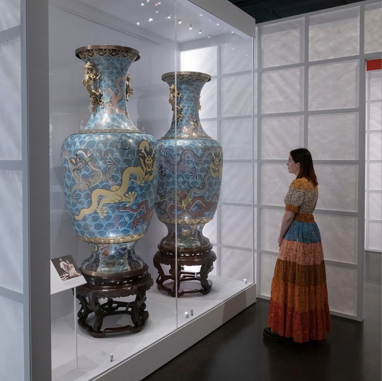 1911年,清政府送给乔治五世两只装饰着蓝色金龙的巨大花瓶,作为加冕礼物。这两只两米高的景泰蓝花瓶从白金汉宫借展。它们的规模表明了一种主张——即便清朝已行至末路,仍然将自己定义为“天下”。但这次展览以无情的细节展示了宫廷自身的臆想与现实的偏离。
