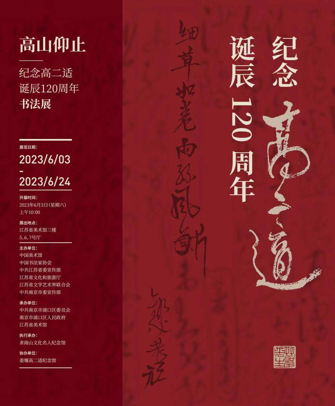 2023年是著名书法家、学者、文化名人高二适先生诞辰120周年,6月3日上午,由中国美术馆、中国书法家协会、中共江苏省委宣传部、江苏省文化和旅游厅、江苏省文学艺术界联合会、中共南京市委宣传部共同主办,中共南京市浦口区委员会、南京市浦口区人民政府、江苏省美术馆具体承办的“高山仰止——纪念高二适诞辰120周年书法展”在江苏省美术馆盛大开幕。