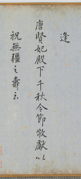 △明代三城王朱芝垝题跋:今逢唐贤妃殿下千秋令节,敬献以祝无疆之寿云。
