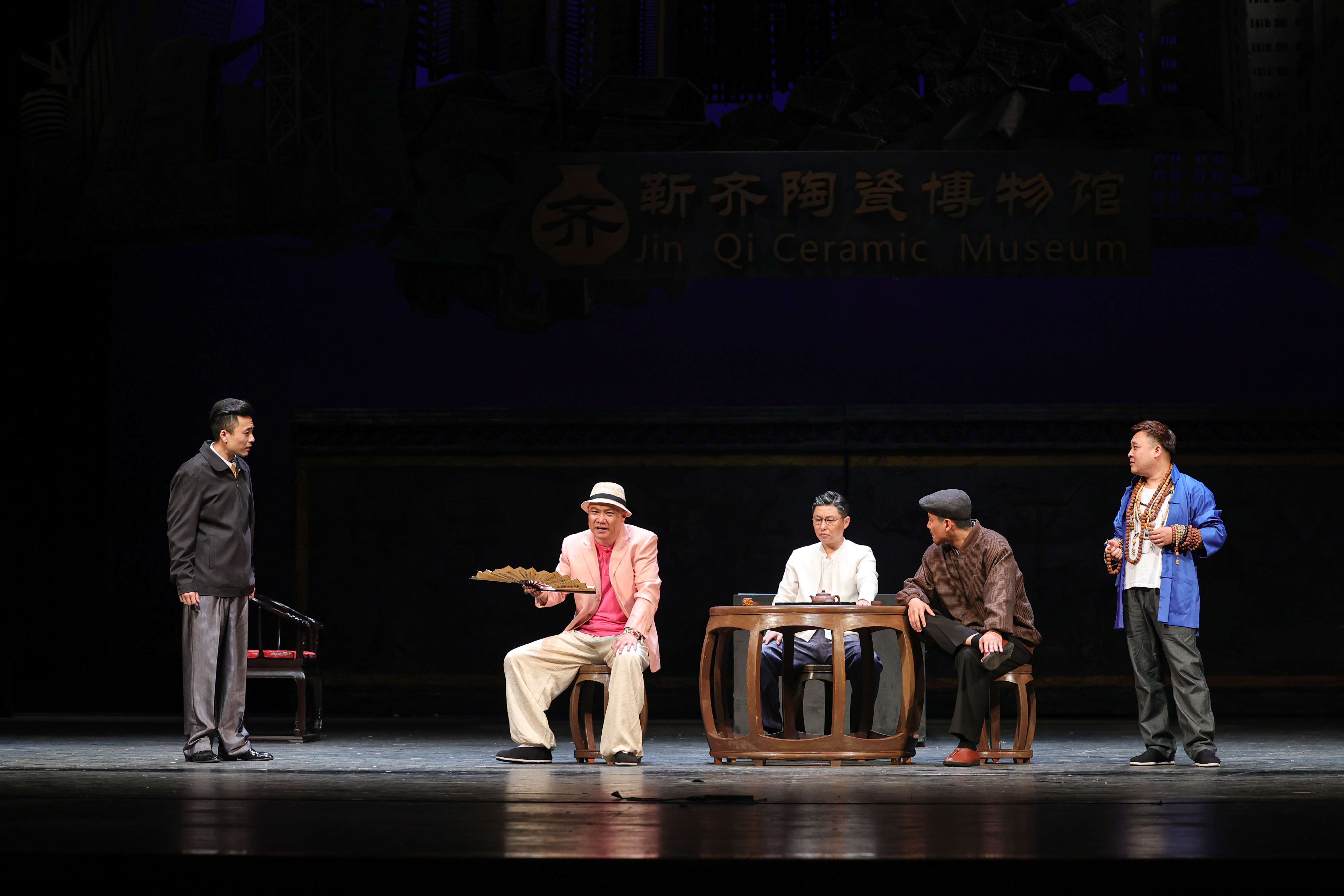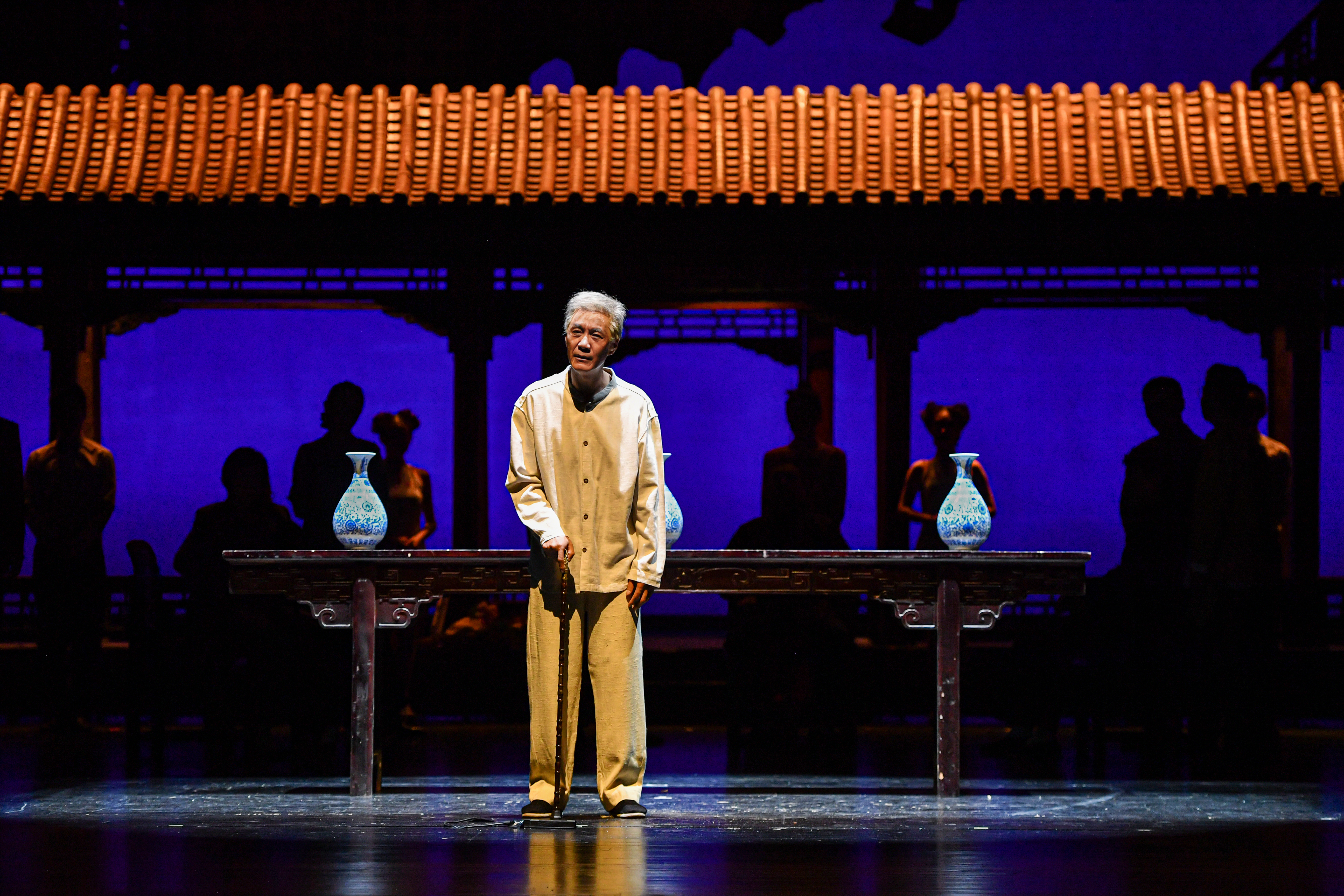 就澎湃新闻记者现场观摩,在全剧高潮的结尾部分,饰演靳伯安的冯远征用拐杖,“砰——砰——砰——”三声脆响,敲碎了桌案上三个一模一样的“元青花”瓷瓶。冯远征瞬间爆发的表演张力与舞台上的碎片横飞,让台下观众不由得发出阵阵惊呼。就在这一刻,全剧终。