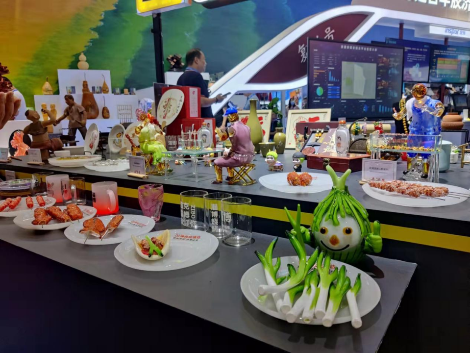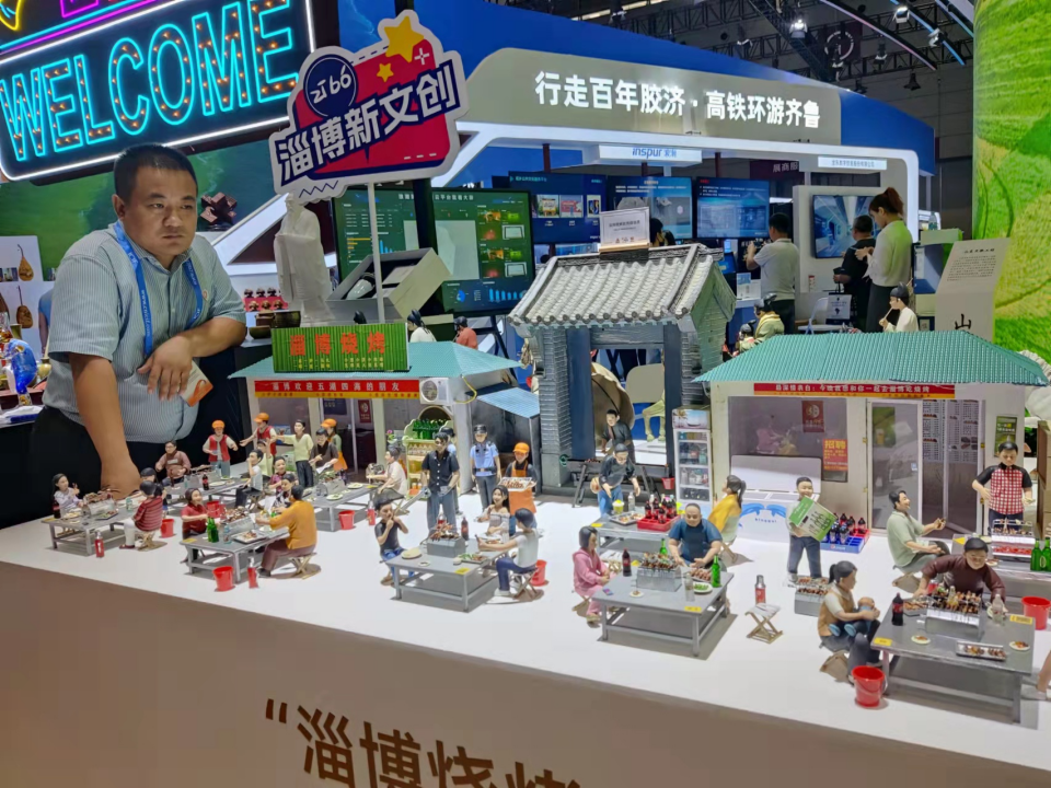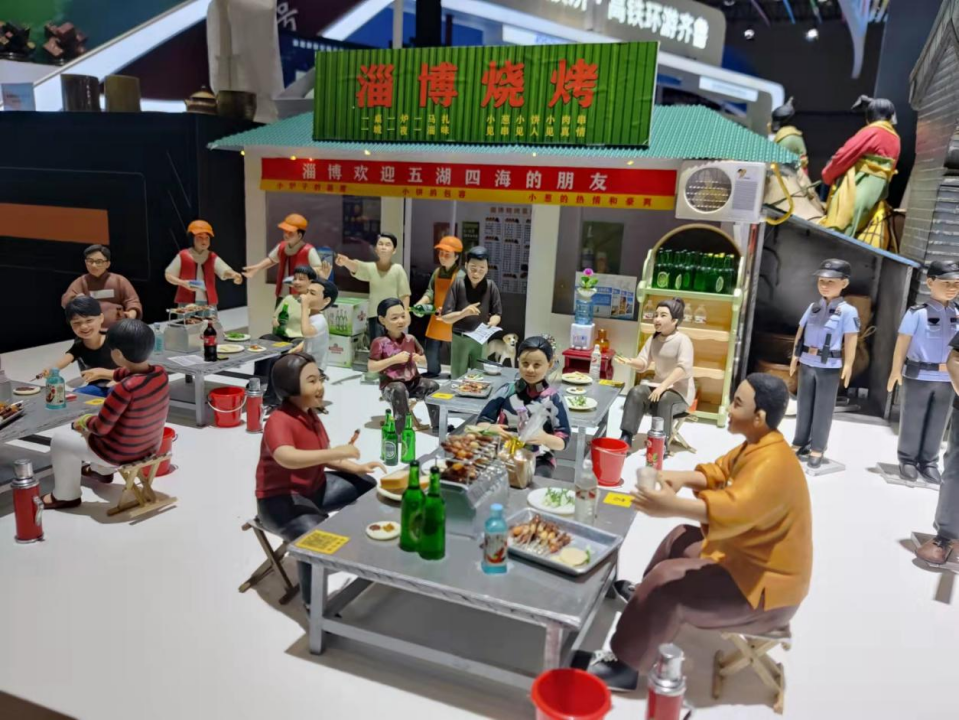 而在微场景中的一条横幅上,写着“淄博欢迎五湖四海的朋友”,表达了这组作品的创作本意。而在一旁的淄博琉璃展台上,淄川振华玻璃制品有限公司打造的烧烤主题的“琉璃大餐”,有着翠绿的“小葱”和浑圆的“面饼”,同样让人流连忘返。这些来自淄博的手艺人表示,能够用自己的双手记录生活的变化,展现家乡的风采,是件非常有意义的事情。