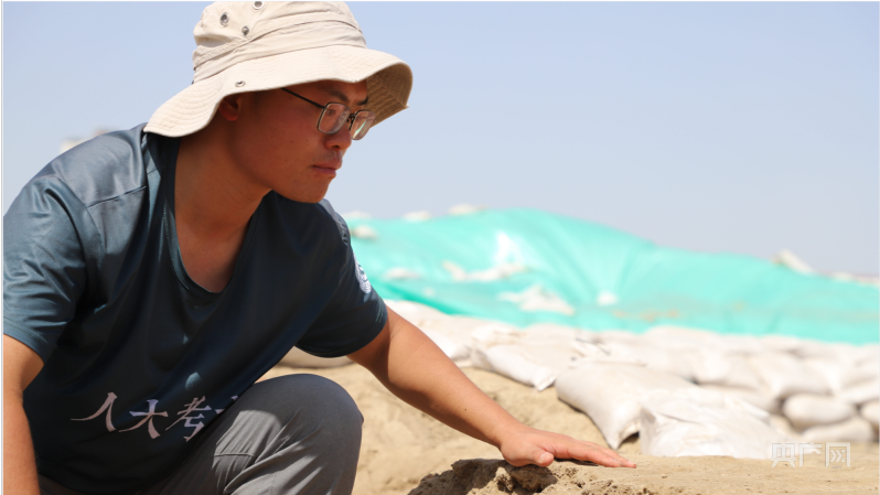 央广网6月10日消息(见习记者姜茸通讯员李杰)新疆的6月,骄阳似火,6月10日,记者走进新疆昌吉回族自治州奇台县唐朝墩古城遗址考古现场,看见中国人民大学历史学院考古文博系博士生兰博正认真观察遗址内佛教寺院墙体的保存状况。