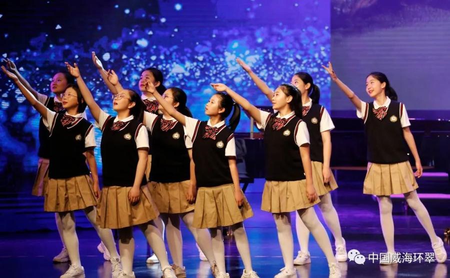 除慷慨激昂的经典歌曲外,当晚的演出现场更是不乏寄寓着深厚情感的本土曲目与清澈纯粹的天籁童声。“淡淡花儿廖清风,轻轻歌儿再吟唱”,威海市第七中学合唱团带来曲目《那段时光》,唱响青春的赞歌;威海市望海园中学合唱团带来《七子之歌—威海卫》,表达了对脚下这片土地的赞美与浓浓深情,引得全场共鸣。