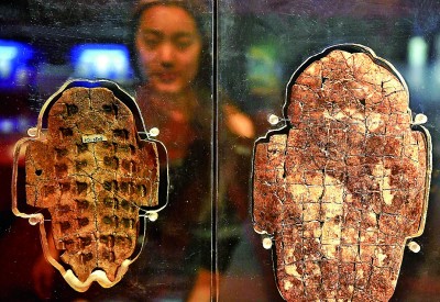 游客在河南安阳殷墟博物馆观看展出的卜甲。新华社发