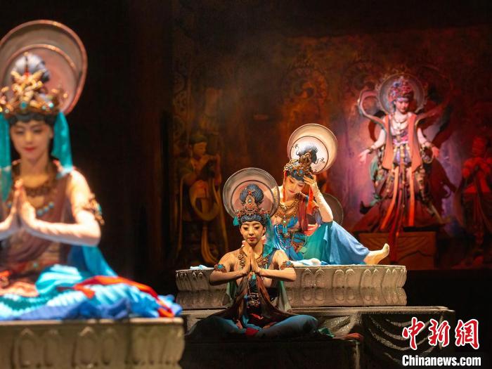 “入场就是藏经洞,分为3个不同洞窟式体验区,在真人与数字影像的虚实交换间呈现一场乐舞盛宴,这是本剧的亮点和创新。”《乐动敦煌》导演张华接受中新社记者采访时说,该剧对壁画和彩塑进行了二次创作,将原本壁画中的菩萨形象塑造成立体佛像,而有些塑像则置入壁画,如此呈现石窟中的经典内容。