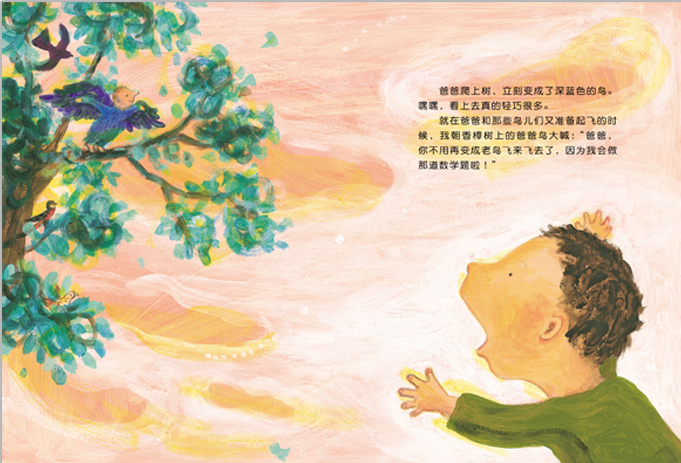 作者说创作这本图画书的灵感就来自于自己的亲身经历:爸爸一遍遍地给儿子讲解一道数学应用题,可孩子就是听不明白。爸爸不放弃,又在纸上画起图来。一旁的妈妈对儿子说,爸爸恨不得变成鸟亲自飞给你看看!