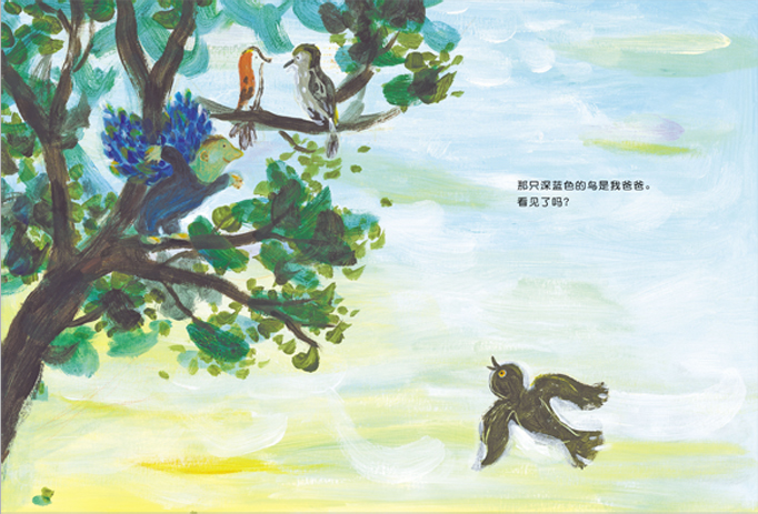 如果说《我爸爸》的风格是“超现实”,那么图画书《那只深蓝色的鸟是我爸爸》则是“浪漫的现实主义”。书中讲了一位胖胖的爸爸,为了让小儿子理解一道减法题,费尽心思、不辞劳苦,扮作一只鸟儿“现场教学”。