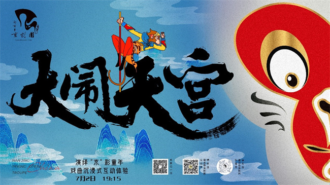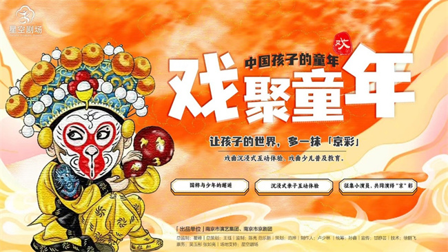 亲子互动京剧《戏聚童年之闹天宫》,由南京市演艺集团联合南京市京剧团打造。表演内容来源于《西游记》中美猴王孙悟空的故事:齐天大圣孙悟空偷桃盗丹、闹天宫,又与巨灵神、青龙、白虎等天兵天将勇斗大战。