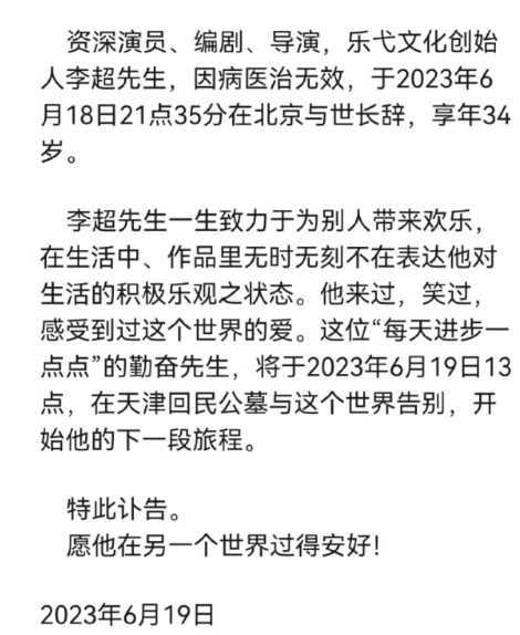 据北京乐弋文化传媒有限公司发布讣告:李超先生因病医治无效,于2023年6月18日21点35分在北京去世,终年34岁。