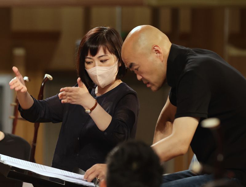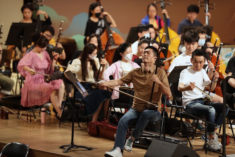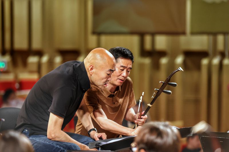 6月19日,指挥刘沙(左)和中央民族乐团乐队首席唐峰在排练林钟·弦乐合奏《良宵》。中国日报记者姜东摄