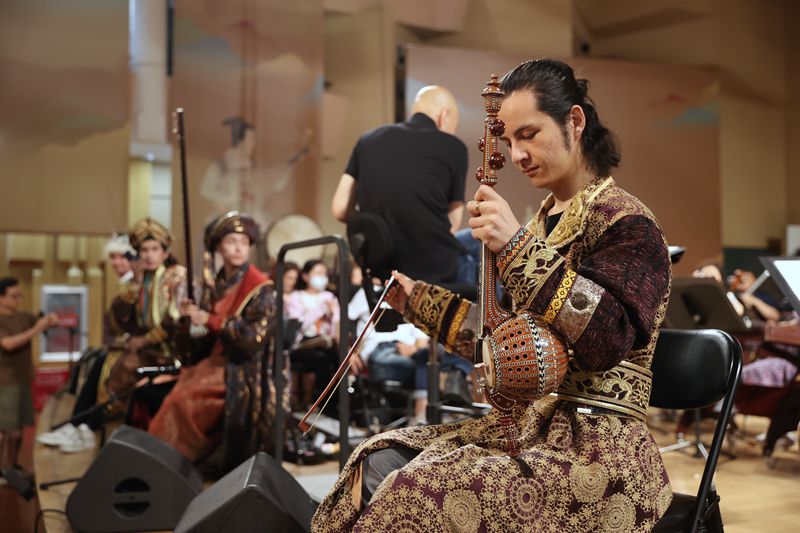 6月19日,乐手艾尔帕提·阿合买提江在排练现场演奏乐器艾捷克。中国日报记者姜东摄