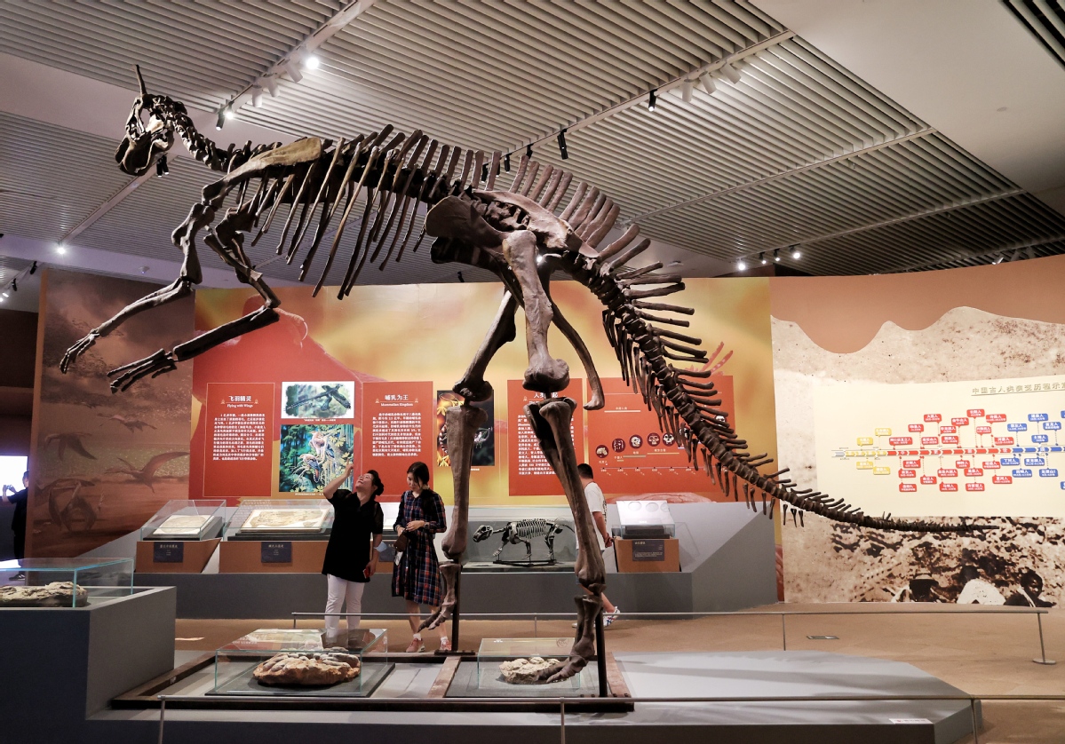 媒体记者参观展出的棘鼻青岛龙模型。中国日报记者姜东摄