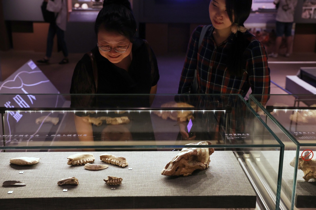 媒体记者参观展出的中国鬣狗头骨化石。中国日报记者姜东摄