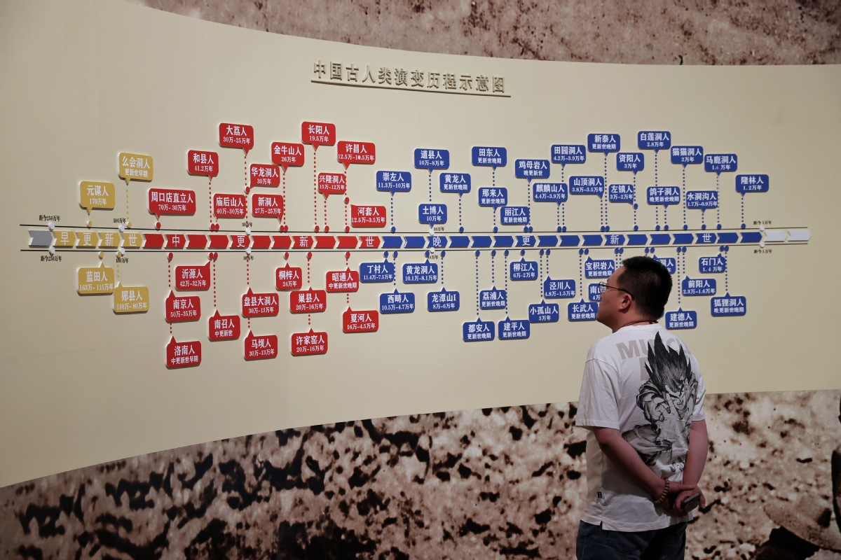 媒体记者参观中国古人类演变历程示意图。中国日报记者姜东摄
