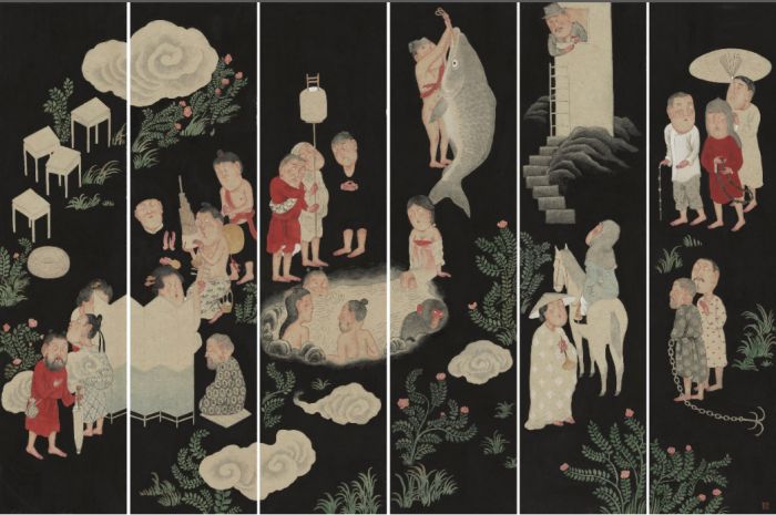 代英伦人群,章回绣像本的寻访纸本设色138×204cm