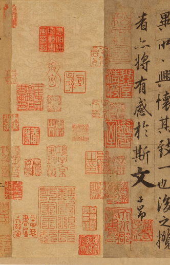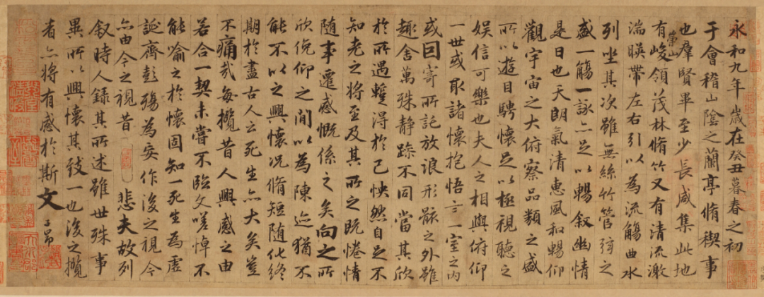《兰亭序》作于王羲之盛年,是其书风集大成之作,被历代书法家誉为“天下第一行书”。自李唐以来,随着王羲之书史地位的确定和《兰亭序》真迹的亡佚,各种形式的《兰亭序》复制品更显珍贵,其中尤以唐代临摹本和定武石刻最为难得。而身为宋太祖赵匡胤十一世孙的赵孟頫,就藏有不少定武善本,许多唐摹本也为赵孟頫友朋辈收藏。