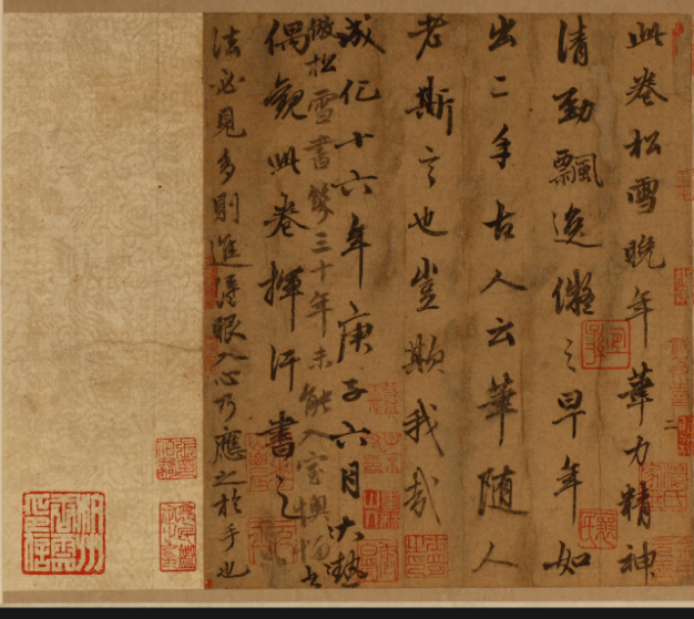 本次所展出的赵孟頫真迹来自无锡博物院,是赵孟頫晚年所临作品,笔法更加圆融如意,带有自身的儒雅遒劲、清和洒落的书法境界。其上钤印跋文从元到清七十有余,极为繁多,证明了其流传有序,也清晰展现出这件作品的坎坷经历。从明代大收藏家项元汴,到明末书画家袁枢袁赋诚父子,又到清代藏家王养度,再至无锡书画家周怀民,周先生嗣后将毕生收藏捐献给家乡的无锡博物院,这件作品才不再是秘不示人的珍藏,大众也有了一睹大师真迹风采的机会。