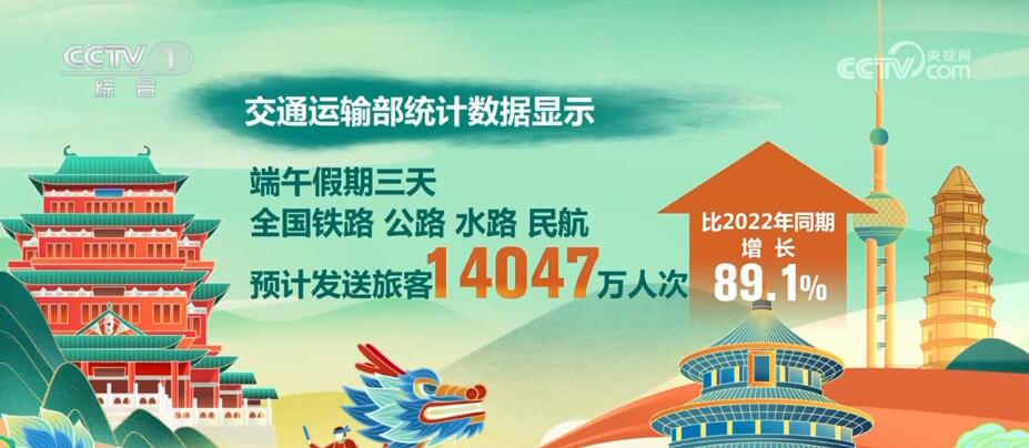 交通运输部统计数据显示,端午假期三天,全国铁路、公路、水路、民航预计发送旅客14047万人次,比2022年同期增长89.1%。