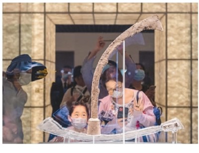 观众欣赏上海市青浦区福泉山遗址出土的象牙权杖。王初摄(人民图片)