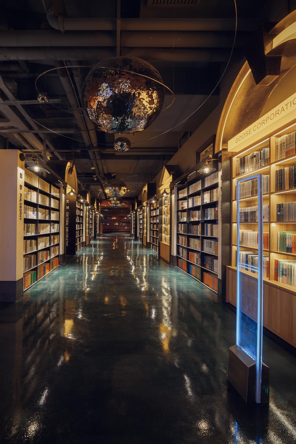 走进鹅社(国金天地馆),就像走进了一个艺术空间。书店正门口的设计是一件装置艺术品,老武汉人一定会一眼识别出熟悉的武汉老巷子里的石库门元素。装置中石库门的残垣和废墟,代表着这个城市的记忆和内生性。顺着一条长长的通道往里走,两侧都是原木色的书柜,这里展示有哲学、人文社科、文学类等精品图书。到达一片圆形的区域之后,抬头又是一件艺术装置,艺术家用天体和宇宙元素演绎“柏拉图洞穴”这个哲学概念,寓意这里将成为思想碰撞之地。再往里走是休闲阅读区,这里提供咖啡、饮品和“时间轻食”。