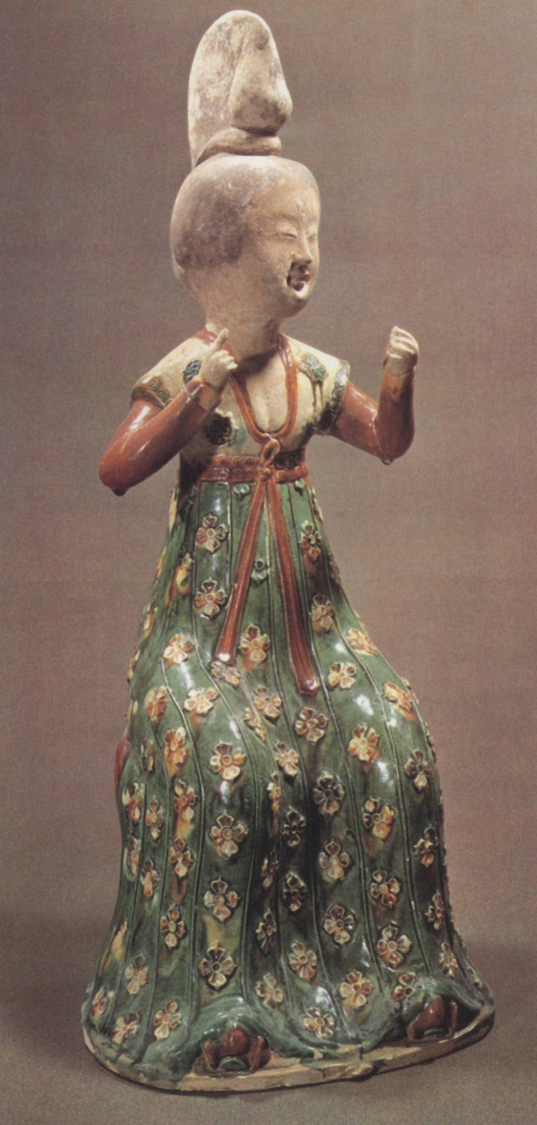 唐代的妆容还流行额黄,又叫鸦黄,即在额间涂上黄色。额黄起源于南北朝,在唐朝盛行。初唐卢照邻《长安古意》有云:“片片行云著蝉鬓,纤纤初月上鸭黄”,李商隐《蝶三首》也说:“寿阳公主嫁时妆,八字宫眉捧额黄”,温庭筠《偶游》吟出“额黄无限夕阳山”,皮日休《木兰后池三咏·白莲》则说:“半垂金粉如何似,静婉临溪照额黄。”唐朝牛僧孺在《幽怪录》中还专门记述了神女智琼把额头化妆成黄色的故事。额黄至宋代时还在流行,宋代诗人彭汝励《妇人面涂黄而吏告以为瘴疾问云谓佛妆也》歌曰:“有女夭夭称细娘,珍珠落鬓面涂黄”。