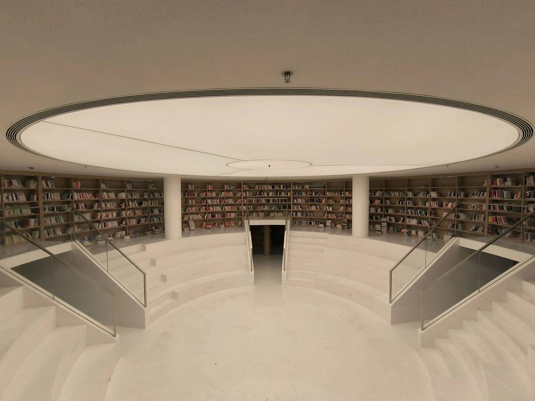 采访中,赵偲也提到了位于馆中的智慧之眼阅览区,其外观是一个巨大的环形建筑,十分典雅静谧。“智慧之眼内部四周设置着阶梯,阶梯上面的墙壁放置藏书,这里寓意着‘书籍是人类进步的阶梯’。整个智慧之眼藏书23000余册。另外,这里也是我们馆企合作的展区之一,是各企业开展活动的区域。”