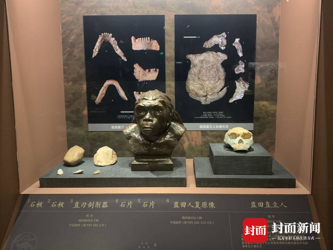 蓝田人复原图及化石。封面新闻见习记者何金蓝摄影