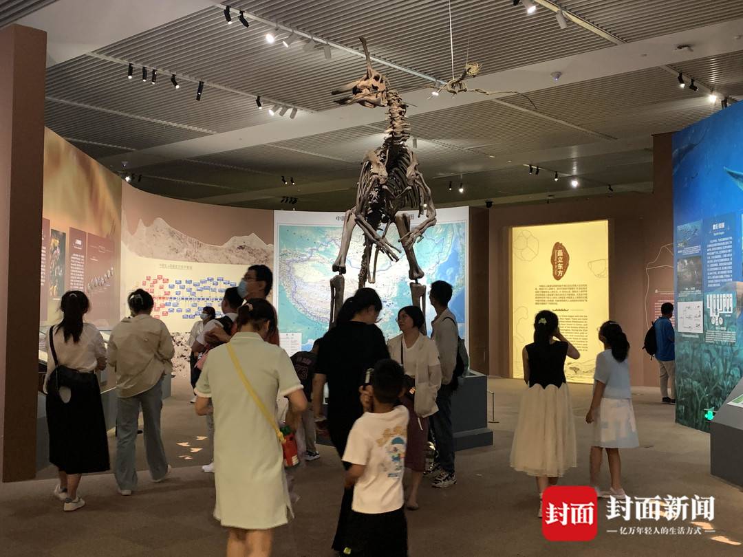 在国博南3展厅,只不过走了几步,穿越的却是数十万年的时空。通过地板上灯光打出小脚印,可以清晰了解观展路径。进入展厅,映入眼帘的便是展厅中最大的来自晚白垩世的恐龙模型——棘鼻青岛龙。它是中华人民共和国成立后出土的第一具完整恐龙骨架,发现于山东莱阳,被称为“新中国第一龙”。