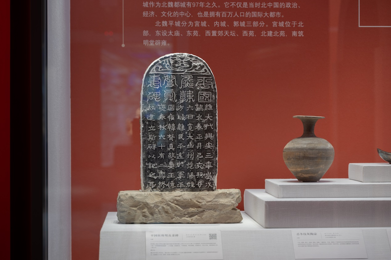 展柜中,平国候韩弩真妻碑是迄今所知北魏平城时期最早的碑形墓志。碑文9行63字,碑上方为圆弧形,有双龙交尾戏珠螭首图形,下刻“平国候韩弩真妻碑”八字篆额。在墓志边上,观众可以看到一组玻璃钵,深蓝色,整体呈半球形,圆唇,圜底,造型精巧别致,从其成分和工艺来看,应是中国本土吹制玻璃器的早期作品。同样值得观看的还有忍冬纹灰陶砖及耳杯,两件物品上的图案属佛教装饰艺术的一种,是北朝装饰艺术的主流,除石窟之外也被广泛运用在北魏建筑、墓葬和生活用品上。