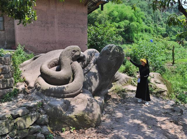 6月27日,当地干部在介绍神臂城内的蛇盘龟玄武石刻。石龟周长20米,背高1.88米,龟背上缠着一条长21.5米的大蟒蛇,用天然整石雕凿而成。新华社记者 刘坤 摄
