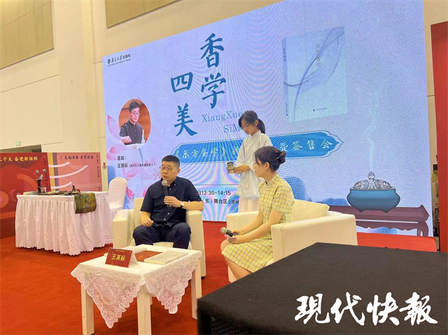 现代快报讯(记者 顾潇)7月1日,第十三届江苏书展在苏州拉开帷幕,当天在苏州博览中心的主会场,扬州文人香非遗传承人王其标给现场读者带来了一场别开生面的新书分享会,和读者一起观“篆字香”,闻金箔香丸,辨识梅雨季节传统香料,让大家在袅袅香气中沉浸式体验了文人香的非遗魅力。